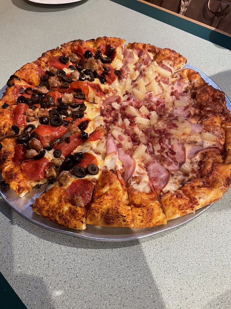An unbelievable combination of flavors. Creamy white garlic alfredo sauce, Canadian bacon, pineapple, bacon, chicken, bbq sauce, sliced jalapeños for a little extra kick.