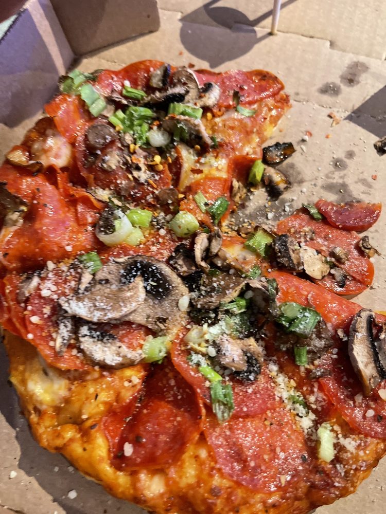 Our five-cheese blend, original red sauce, pepperoni, homemade recipe Italian sausage, roasted red peppers, green onions, tomatoes, chopped garlic, shredded aged Parmesan cheese.