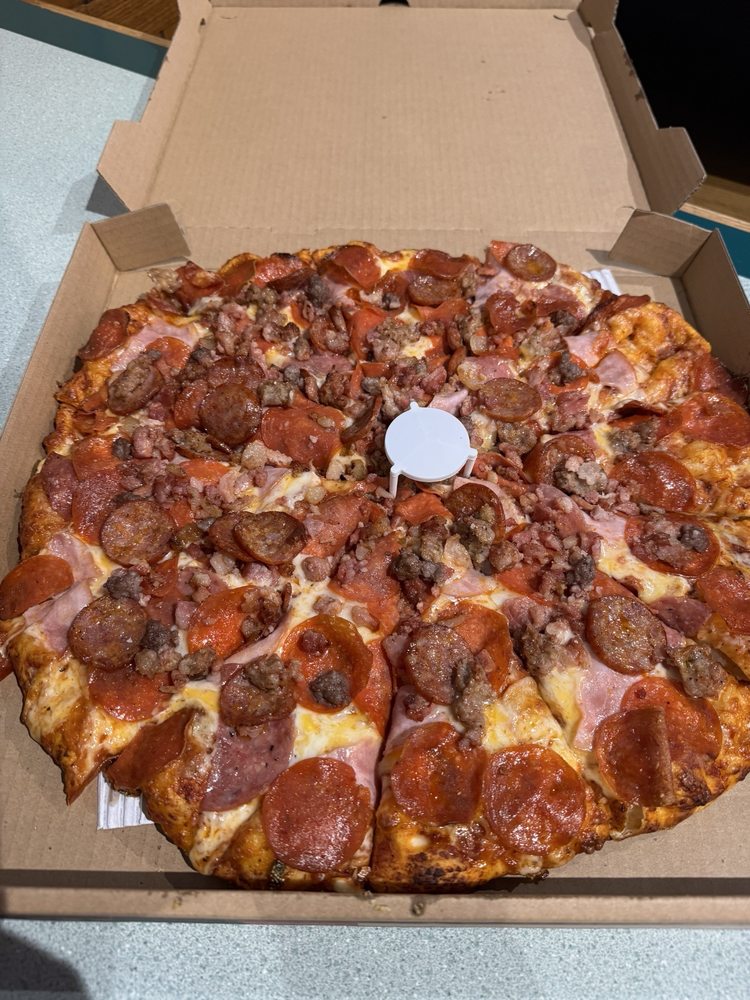 A must for any meat lover. Our original red sauce, our famous five-cheese blend, savory USDA choice meats: salami, pepperoni, Canadian bacon, linguica, bacon, ground beef, our homemade recipe sausage.